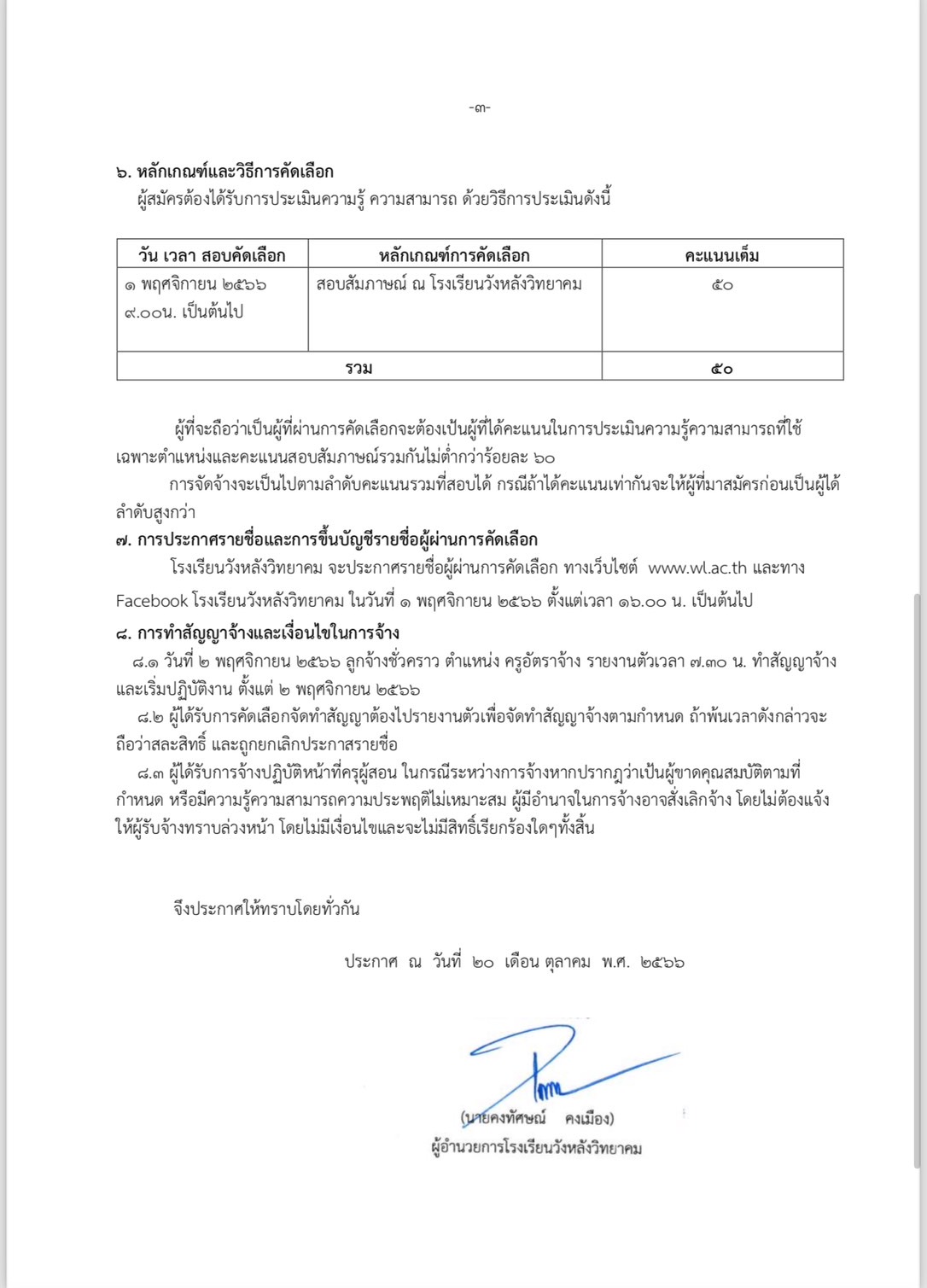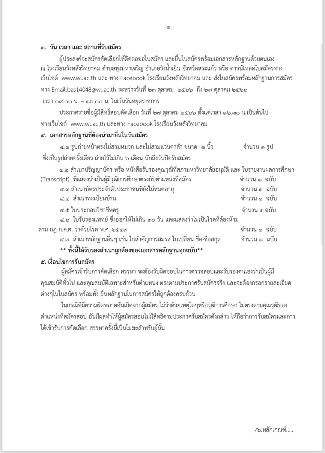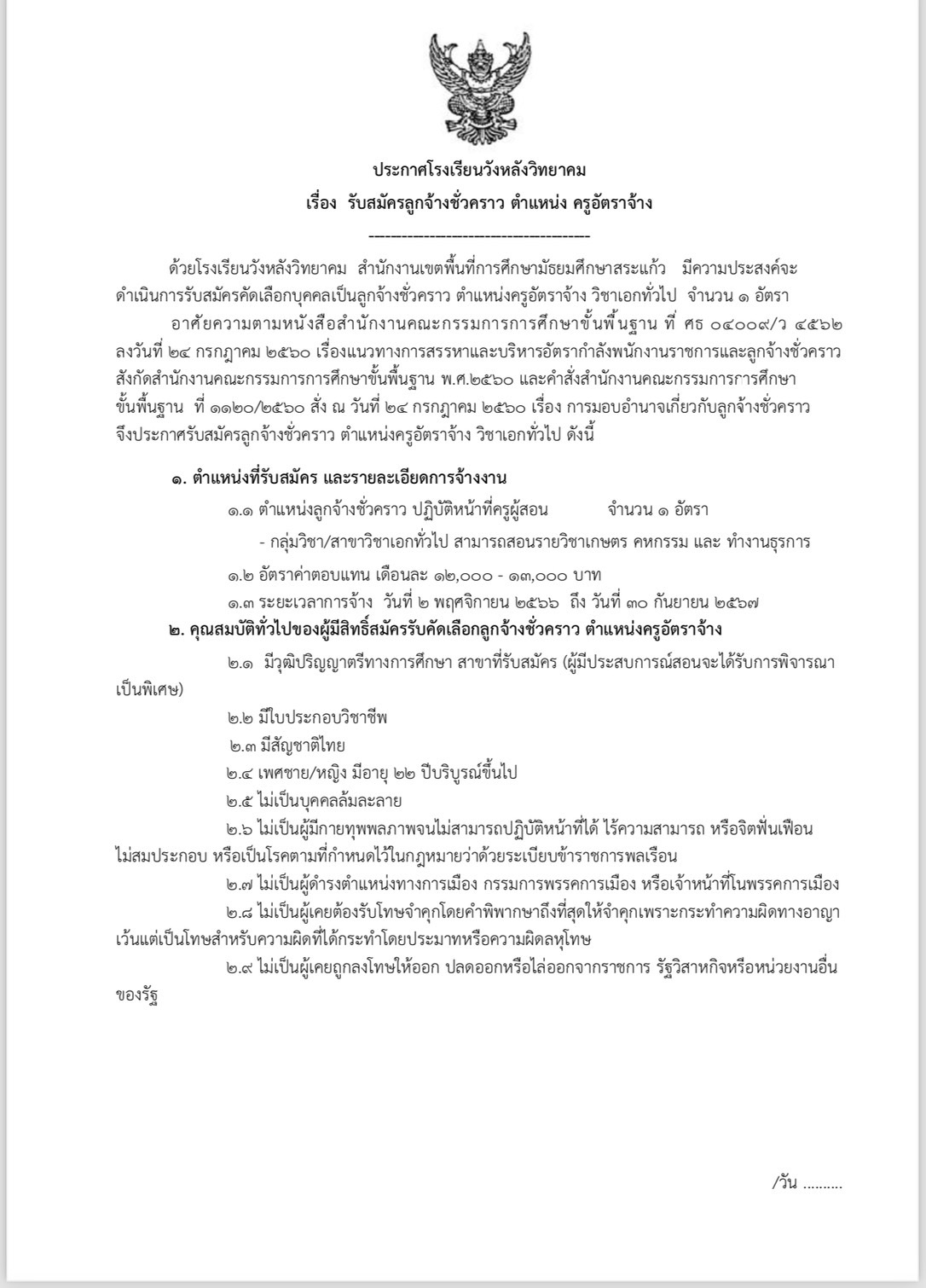 เรื่อง รับสมัครลูกจ้างชั่วคราว ตำแหน่ง ครูอัตราจ้าง ด้วยโรงเรียนวังหลังวิทยาคม สำนักงานเขตพื้นที่การศึกษามัธยมศึกษาสระแก้ว มีความประสงค์จะดำเนินการรับสมัครคัดเลือกบุคคลเป็นลูกจ้างชั่วคราว ตำแหน่งครูอัตราจ้าง วิชาเอกทั่วไป จำนวน 1 อัตรา อาศัยความตามหนังสือสำนักงานคณะกรรมการการศึกษาขั้นพื้นฐาน ที่ ศธ 04009/ว 4562 ลงวันที่ 24 กรกฎาคม 2560 เรื่องแนวทางการสรรหาและบริหารอัตรากำลังพนักงานราชการและลูกจ้างชั่วคราวสังกัดสำนักงานคณะกรรมการการศึกษาขั้นพื้นฐาน พ.ศ.2560 และคำสั่งสำนักงานคณะกรรมการการศึกษา ขั้นพื้นฐาน ที่ 1120/2560 สั่ง ณ วันที่ 24 กรกฎาคม 2560 เรื่อง การมอบอำนาจเกี่ยวกับลูกจ้างชั่วคราว จึงประกาศรับสมัครลูกจ้างชั่วคราว ตำแหน่งครูอัตราจ้าง วิชาเอกทั่วไป ดังนี้ 1. ตำแหน่งที่รับสมัคร และรายละเอียดการจ้างงาน 1.1 ตำแหน่งลูกจ้างชั่วคราว ปฏิบัติหน้าที่ครูผู้สอน จำนวน ๑ อัตรา - กลุ่มวิชา/สาขาวิชาเอกทั่วไป สามารถสอนรายวิชาเกษตร คหกรรม และ ทำงานธุรการ 1.2อัตราค่าตอบแทน เดือนละ 12,000 - 13,๐๐๐ บาท 1.3 ระยะเวลาการจ้าง วันที่ 2 พฤศจิกายน 2566 ถึง วันที่ 30 กันยายน 2567 วัน เวลา และ สถานที่รับสมัคร ผู้ประสงค์จะสมัครคัดเลือกให้ติดต่อขอใบสมัคร และยื่นใบสมัครพร้อมเอกสารหลักฐานด้วยตนเอง ณ โรงเรียนวังหลังวิทยาคม ตำบลทุ่งมหาเจริญ อำเภอวังน้ำเย็น จังหวัดสระแก้ว หรือ ดาวน์โหลดใบสมัครและรายละเอียดการับสมัคร ทางเว็บไซต์ www.wl.ac.th และ ทาง Facebook โรงเรียนวังหลังวิทยาคม ผ่านลิ้งค์ https://drive.google.com/drive/folders/1GUMzAl_w_zTbpm20OCTrePIy-xBeBzth?usp=sharing และ ส่งใบสมัครพร้อมหลักฐานการสมัคร ทาง Email:bas14048@wl.ac.th ระหว่างวันที่ 23 ตุลาคม 2566 ถึง 27 ตุลาคม 2566 เวลา 09.00 น. – 16.00 น. ไม่เว้นวันหยุดราชการ ประกาศรายชื่อผู้มีสิทธิ์สอบคัดเลือก วันที่ 27 ตุลาคม 2566 ตั้งแต่เวลา 16.30 น.เป็นต้นไป ทางเว็บไซต์ www.wl.ac.th และทาง Facebook โรงเรียนวังหลังวิทยาคม |